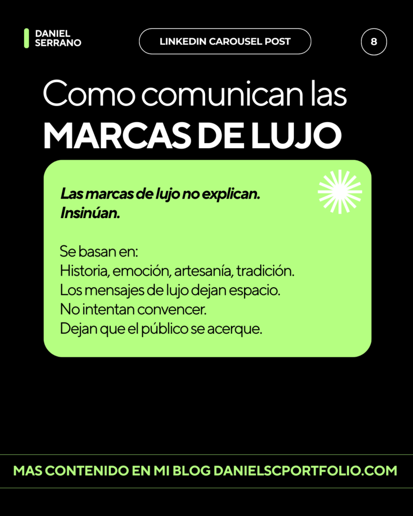 Las marcas luxury eliminan ruido: pocas palabras, imágenes cuidadas y una narrativa aspiracional.